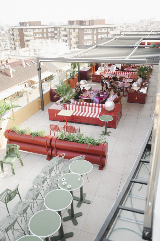 La programación musical, el ambiente cosmopolita y el diseño con personalidad lo posicionan como uno de los rooftops más atractivos de la ciudad. Cada zona está definida por grandes módulos rojos revestidos con azulejos burdeos, que funcionan como cómodos sofás y a la vez crean una separación visual entre el restaurante y el bar. Más allá, una zona chill out en tonos terracota invita a relajarse y alargar la tarde con estilo.