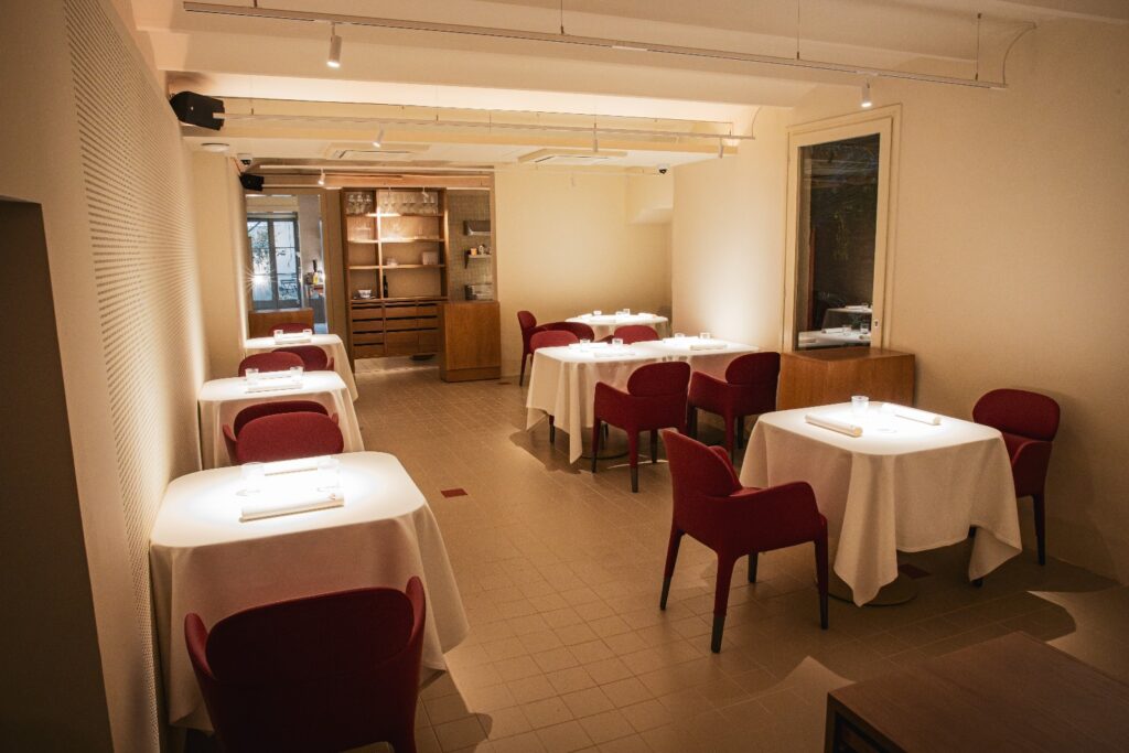 La experiencia de Melós comienza en la barra, situada junto a la entrada del restaurante, revestida de rojo y materiales nobles. Es el espacio dispuesto para ponerse en situación, disfrutar de una copa o aperitivo previo al menú, o simplemente dejarse llevar por el ambiente. Desde allí se accede a la luminosa sala principal, donde los tonos neutros, las maderas claras y el burdeos de las butacas facilitan el confort.